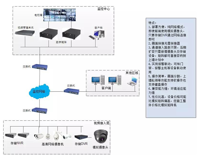 應(yīng)用場(chǎng)景 | 64路以下的局域網(wǎng)項(xiàng)目。其 中,DVR用在模擬攝像機(jī)上; NVR用在高清攝像機(jī)上。 | 同左 | 局域相對(duì)集中的環(huán)境, 且必須全部是模擬攝像機(jī) | 無論環(huán)境是集中還是分散,是幾十路還是幾千路,都可以。各種廠家,無論高清還是模擬環(huán)境,還是混雜環(huán)境,都適合 |